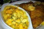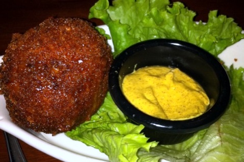 Nevertheless, our scantily-clad waitress, Kristen, was very nice and enthusiastic. We started with Scotch Eggs, which are basically hard boiled eggs wrapped in sausage and deep fried. Sounds disgusting to me, but they were surprisingly good! J had the fish and chips with a side of mac and cheese. Both were actually really good, especially the mac and cheese. Yum! I was full from the Scotch eggs, so I just had a cup of the daily soup – a delicious hearty vegetable soup.
