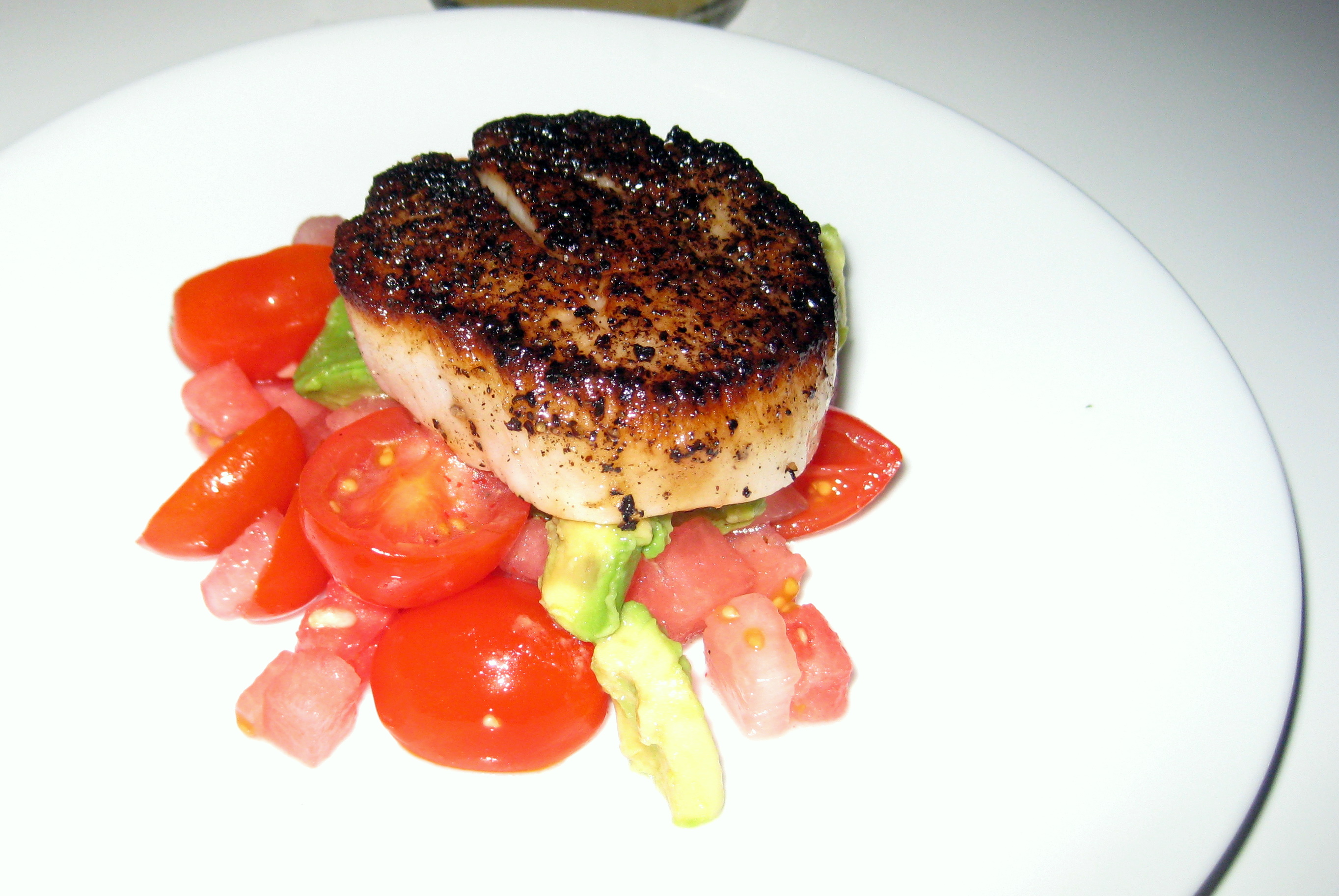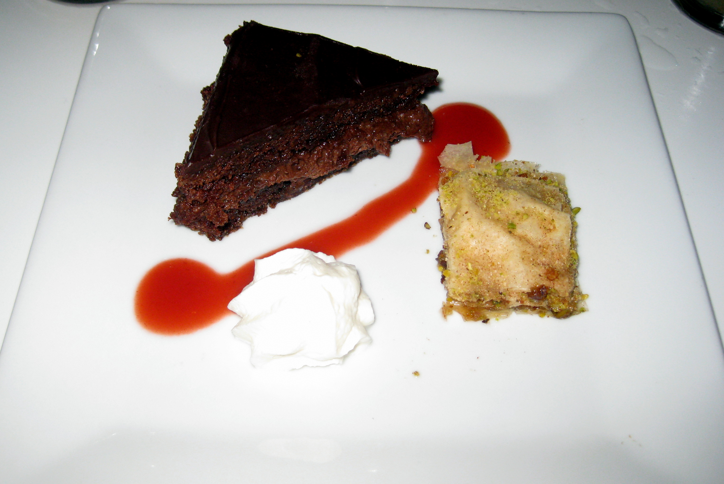 The 10 pm seating was a $65 4-course prix fixe menu, which was not published in advance and made us a little leery. We were pleased when we finally had the chance to peruse the menu. The first course was a seared scallop and tomato and avocado salad. Second course was a veal cheeks ravioli. Third course offered the choice of seared ahi tuna, roasted duck breast, and braised short rib. And, dessert was a chocolate ganache bite with a little piece of cinnamon baklava and a dollop of cream. All sounded really yum, so we were glad we made the reservation.