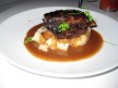 Three of us at the table really enjoyed the scallop, but one diner’s scallop was underdone. The next course, the veal cheek ravioli was good, and the veal filling was reminiscent of Indian food. Between the four of us, we tried all three of the 3rd course choices. Although, I did not try it, I hear that the ahi tuna was quite good. I had the roasted duck breast. It was served with a nice crisp skin and had a tinge of pink, as properly prepared duck should. The only issue was that is was served on a room temperature plate and quickly lost its heat. Similarly, the braised short rib was presented on an unheated plate. The rib was well-prepared and was tender and falling off the bone. J said that the sauce that accompanied the rib was his favorite part of the dish. As ambitious as the first three courses were, the dessert fell a bit short. It was tasty, but obviously pre-plated and not as inventive as some of the early courses.
