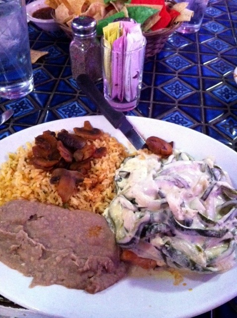 My friend ordered the Chile Relleno, one of her favorite dishes, and I ordered the Pechuga Poblano, described as a chicken breast cooked on the grill with the flame of the charcoal, topped with rajas de chile poblano (poblano chile strips).  Sounds super yummy right?  I knew it wasn’t going to be good when our dishes were delivered approximately 5 minutes later.  Apparently, the Chile Relleno was edible, however, the Pechuga Poblano was not.  The chicken was buried under a creamy sauce with poblano strips which had definitely been sitting around for a while.  The chicken underneath was room temperature and chewy.  It had not seen the “flame of the charcoal” or a grill in quite some time, if ever.  The rice and refried beans it was served with were also room temperature and pretty tasteless.  I took a couple bites of the chicken before I decided that it could give me food poisoning.