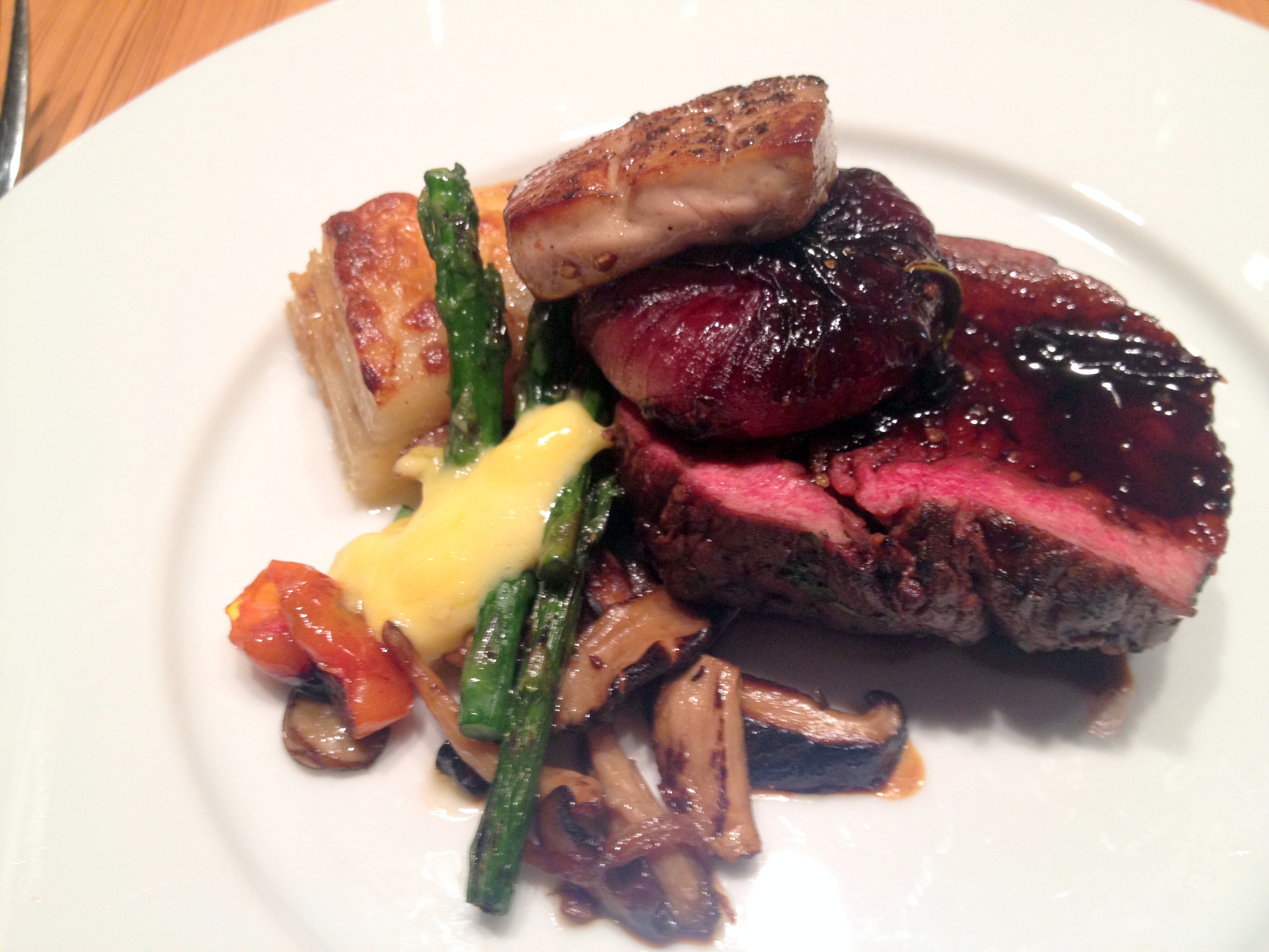 Our final main food course – yes, there was more – was grilled and roasted beef tenderloin topped with a piece of seared Hudson Valley grade “A” foie gras. Score! Accompanying this was perhaps the best potato gratin ever made (it was ridiculously good), baby asparagus, and a red wine shallot sauce. I lucked out here because we had a vegetarian at the table who willingly gave up her foie gras to me (score again!). You haven’t lived until you’ve had beef tenderloin topped with foie gras. Of all the fat flavorings there are (butter, duck fat, etc.), and I’ve probably had them all, nothing compares to that of foie gras.